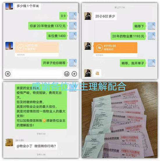 一些業(yè)主主動的咨詢自家的物業(yè)費交到了什么時候;有的業(yè)主二話不說直接微信轉賬給了我們的物業(yè)人員;還有的業(yè)主直接把現金放在前臺,說了房號后,馬上悄然離去;更有業(yè)主直接交了之后連續(xù)幾年的物業(yè)費。這讓我們感動不已,我們知道,這是您對我們的信任,是對疫情防控一線瑞源人的最大支持!